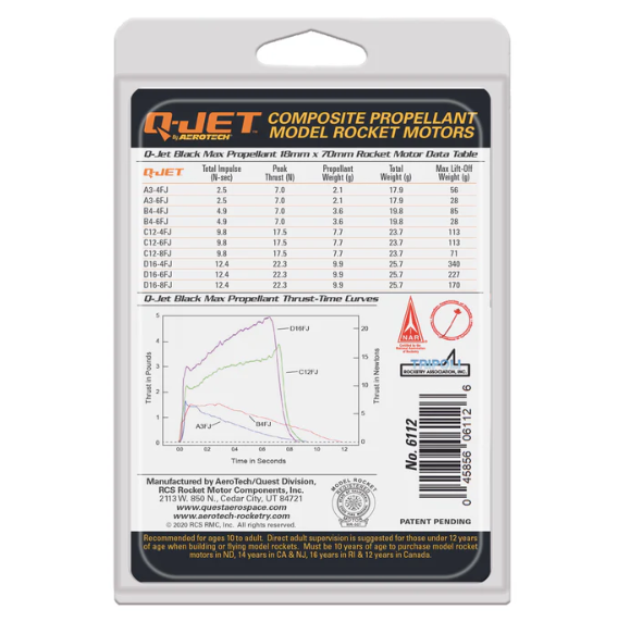 Quest Q-Jets are the world’s most advanced 18mm model rocket motors. Q-Jet™ high performance, composite propellant model rocket motors use the same family of solid propellant as NASA’s Space Shuttle Boosters, military missiles, sounding rockets, and NASA’s future SLS moon rocket. They utilize a patent pending high-strength polymer case and bulkhead, ceramic nozzle and RCSs exclusive White Lightning™ aerospace grade composite propellant formulation, which produces nearly double the specific impulse (or ISP, a propellant efficiency rating) of conventional black powder propellant. They are not susceptible to thermal cycling like black powder motors. Q-Jet™ White Lightning™ rocket motors deliver a brilliant white exhaust plume, dense bright white smoke trail and a throaty roar as the hallmarks of this popular propellant. Easy to track. Exciting to watch!